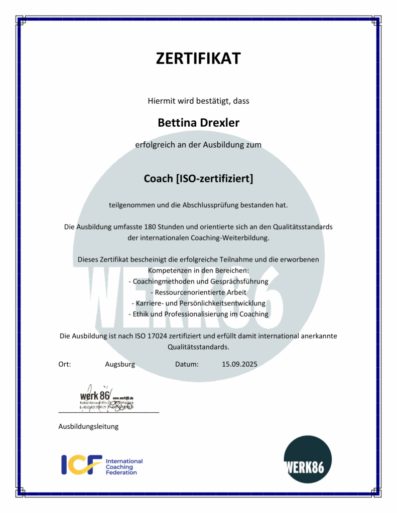 Nach 180 intensiven Ausbildungsstunden halte ich nun stolz mein Zertifikat als Coach in den Händen. Diese Zeit war weit mehr als eine reine Weiterbildung – sie war eine persönliche Reise voller Erkenntnisse, Begegnungen und Wachstumsmomente.